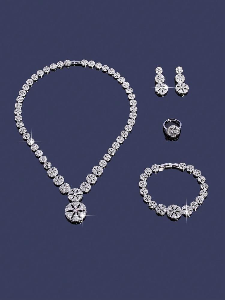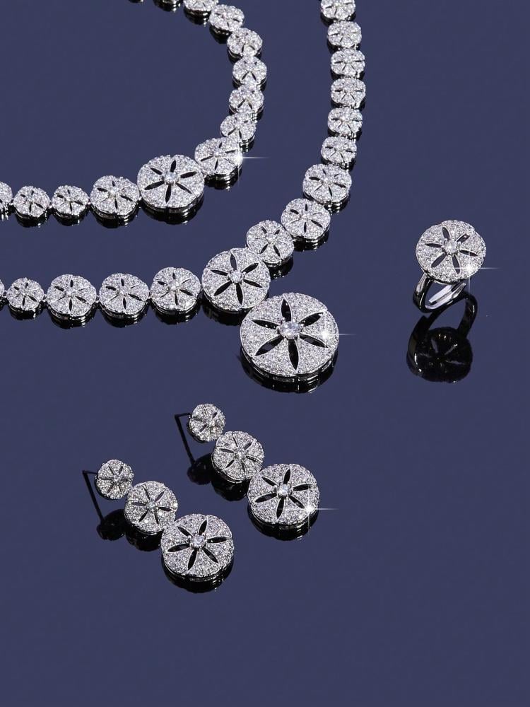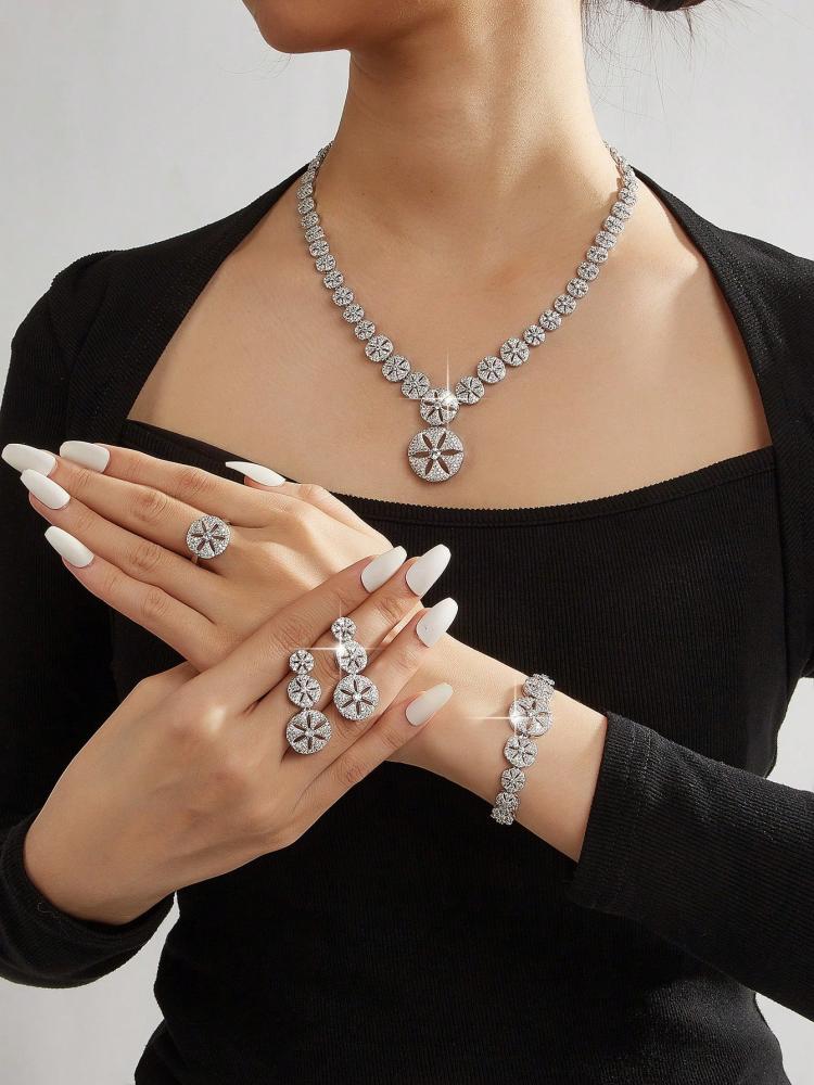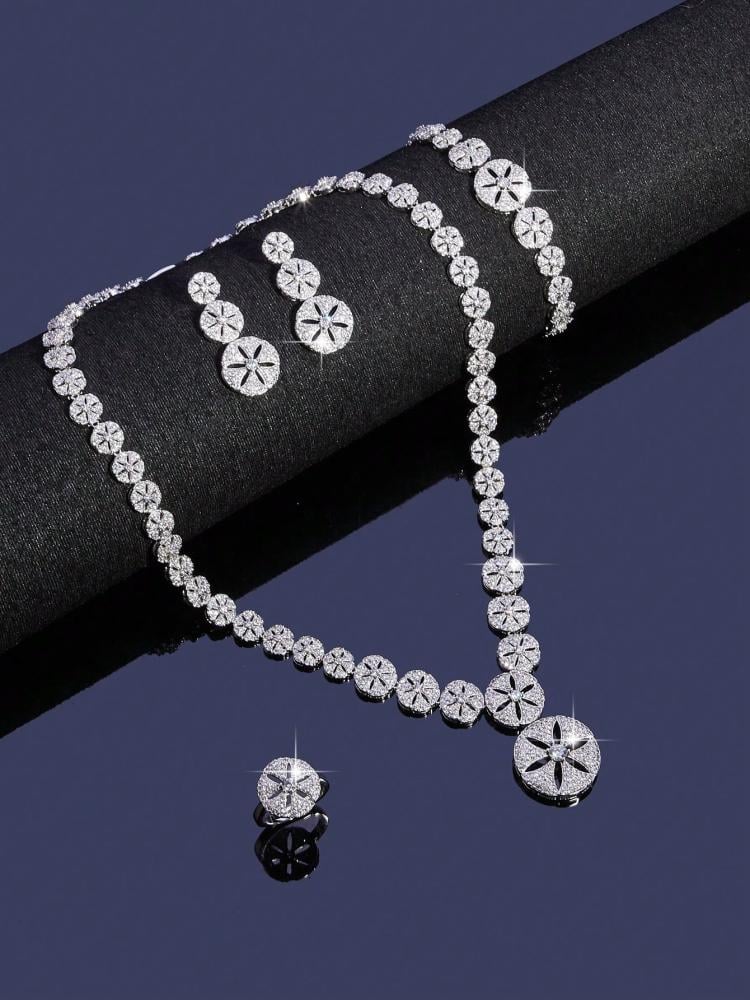 مجموعة مجوهرات مكونة من 5 قطع مرصعة بالحجر المكعب، تضيف لمسة من الفخامة والأناقة لكل إطلالة. مصممة بلون فضي جذاب مع مواد سبائك مطلية، لتكمل جمالك في المناسبات الرسمية وغير الرسمية.