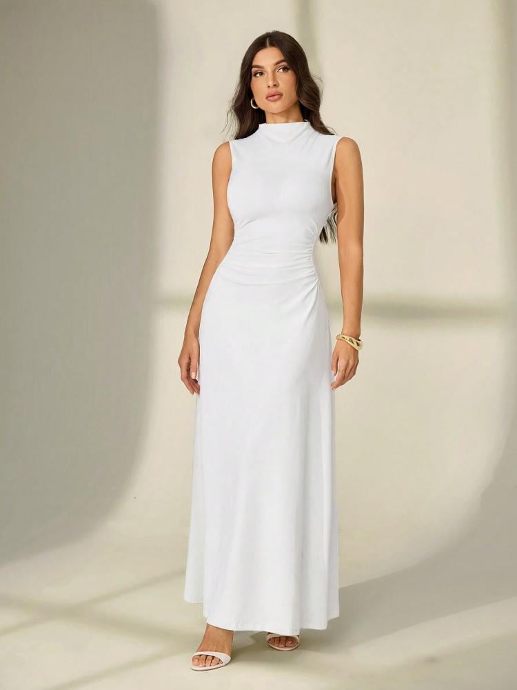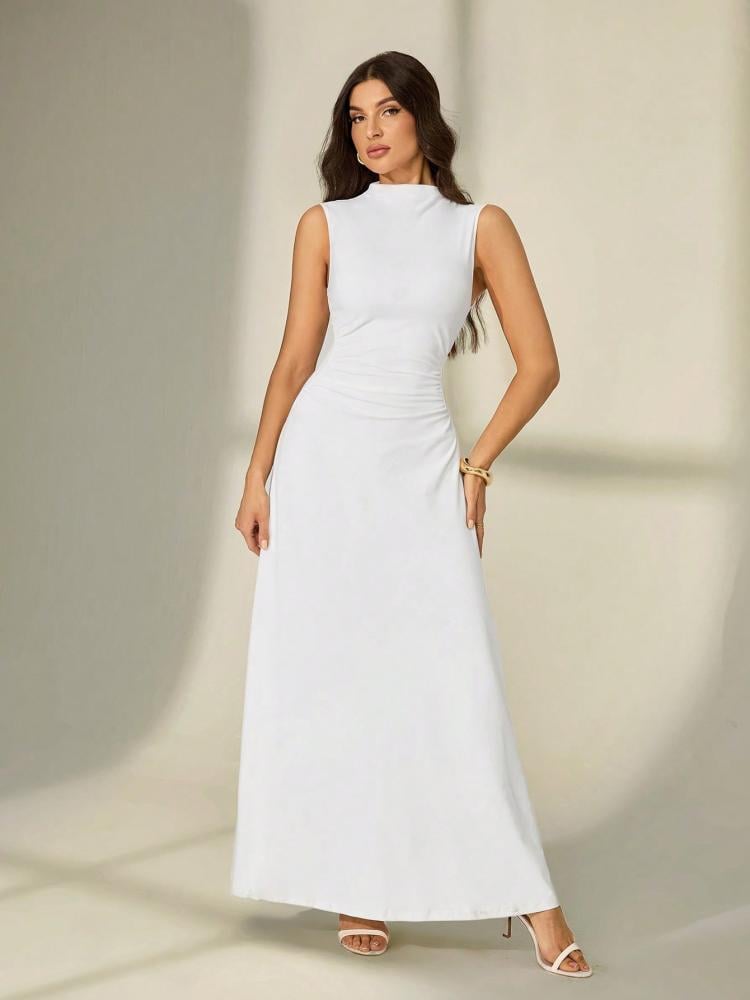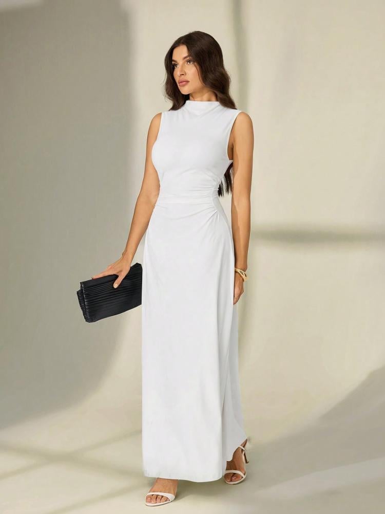 فستان ماكسي طويل بياقة عمودية بدون أكمام بلون أبيض نقي، تصميم عصري وأنيق يناسب مختلف المناسبات. يضفي لمسة من الفخامة والراحة بفضل تصميمه البسيط والمميز، مما يجعله خياراً مثالياً للسهرات والمناسبات الخاصة.