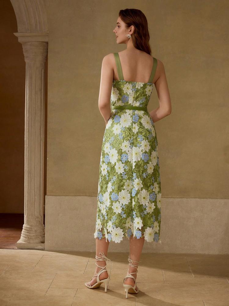 فستان ورود كامي بتطريز الدانتيل بلون أخضر أنيق، تصميم أنثوي فاخر بدون أكمام مع حزام خصر ليوفر لك إطلالة متكاملة. الدانتيل الرائع يضيف لمسة من الرقي، مما يجعله الخيار المثالي للمناسبات الخاصة والسهرات.